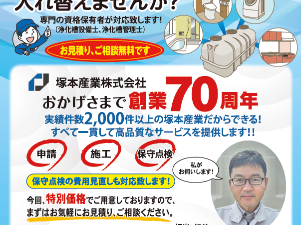 単独処理浄化槽から合併処理浄化槽へ入れ替えませんか? 専門の資格保有者が対応いたします。(浄化槽設備士、浄化槽管理士) お見積り、ご相談は無料です。