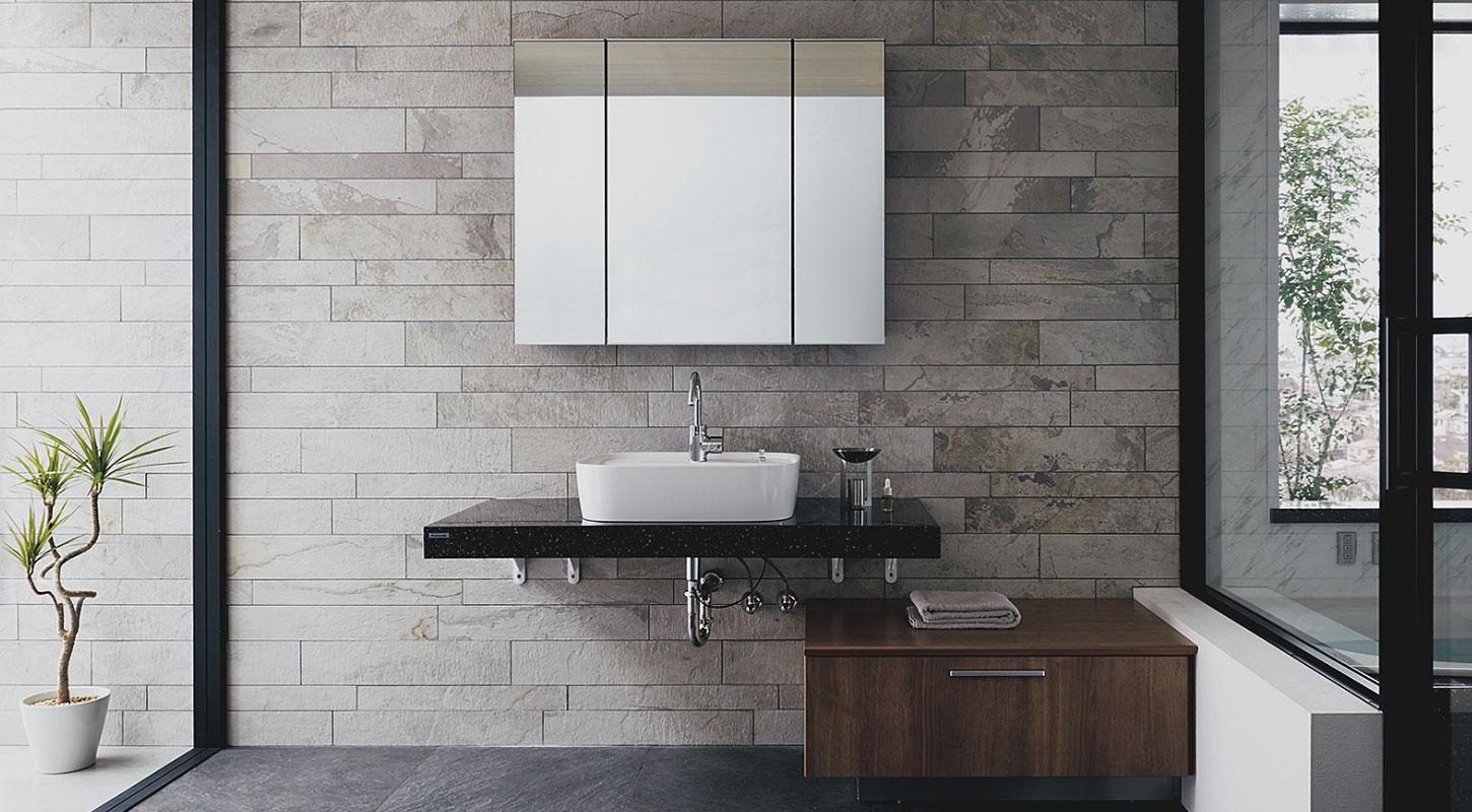 自分と向き合い、磨くためのサニタリー。 脱衣所と浴室を繋いだり、玄関から直行できたり、洗面化粧台は、住空間の中でいちばん暮らし方の個性がでる場所。 だから手入れが楽で清潔で美しく、ストレスなく使えることが大切です。